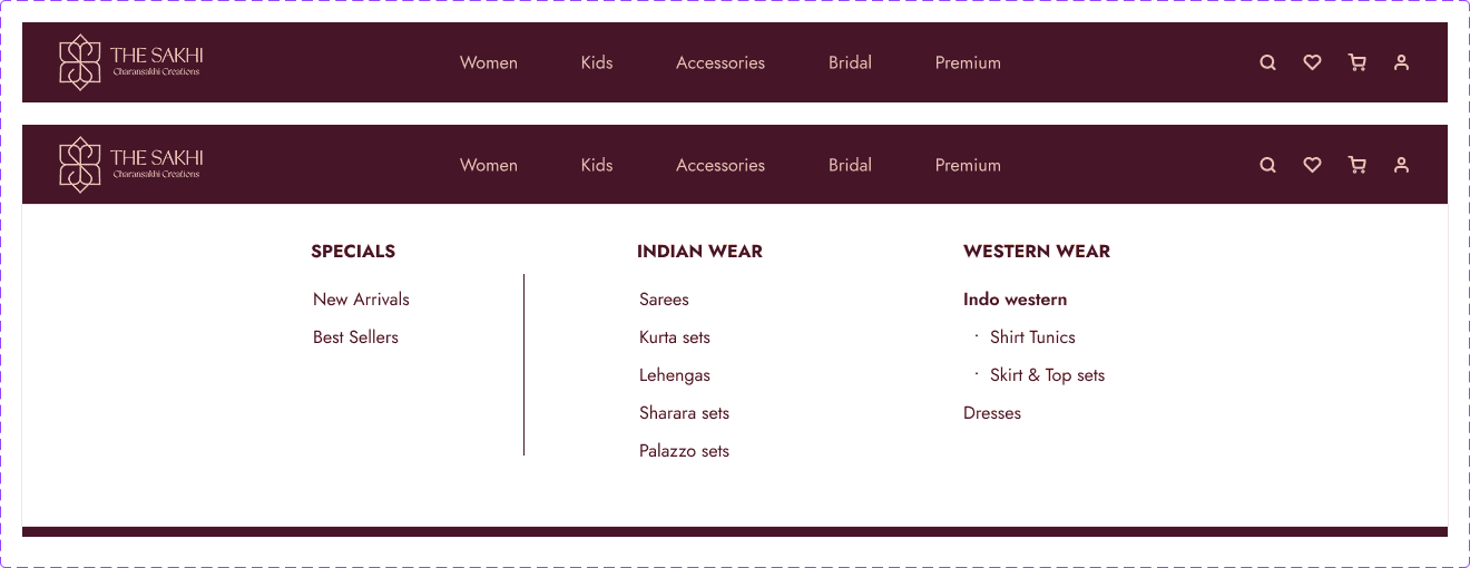 Our card sorting exercise and user interviews revealed three distinct shopping behaviors: customers seeking traditional Indian wear, those preferring Western styles, and users specifically searching for fusion pieces. Based on these insights, we created dedicated Indian and Western sections for clear style preferences, an Indo Western category for fusion seekers, a Specials section featuring New Arrivals and Best Sellers for trend-conscious shoppers, and a specialized Bridal section—ensuring seamless navigation for all user segments.